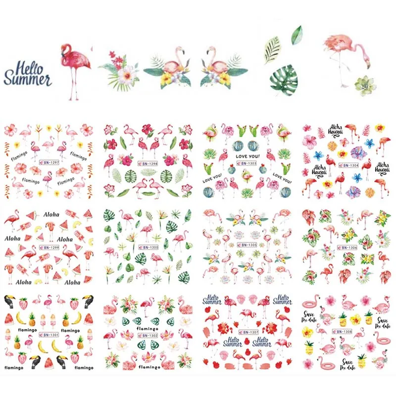 discounted 1 Set 12 Designs New Nail Stickers Cartoon Flamingo Animal Water Decals Nail Art Decorations Wraps