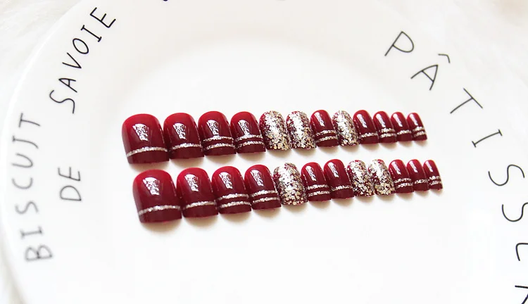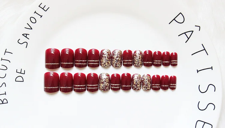 remarkable New Fashion Wine Red False Nails 24Pcs Short Oval Kit Champagn Sequins Decor Faux Ongles Artificial